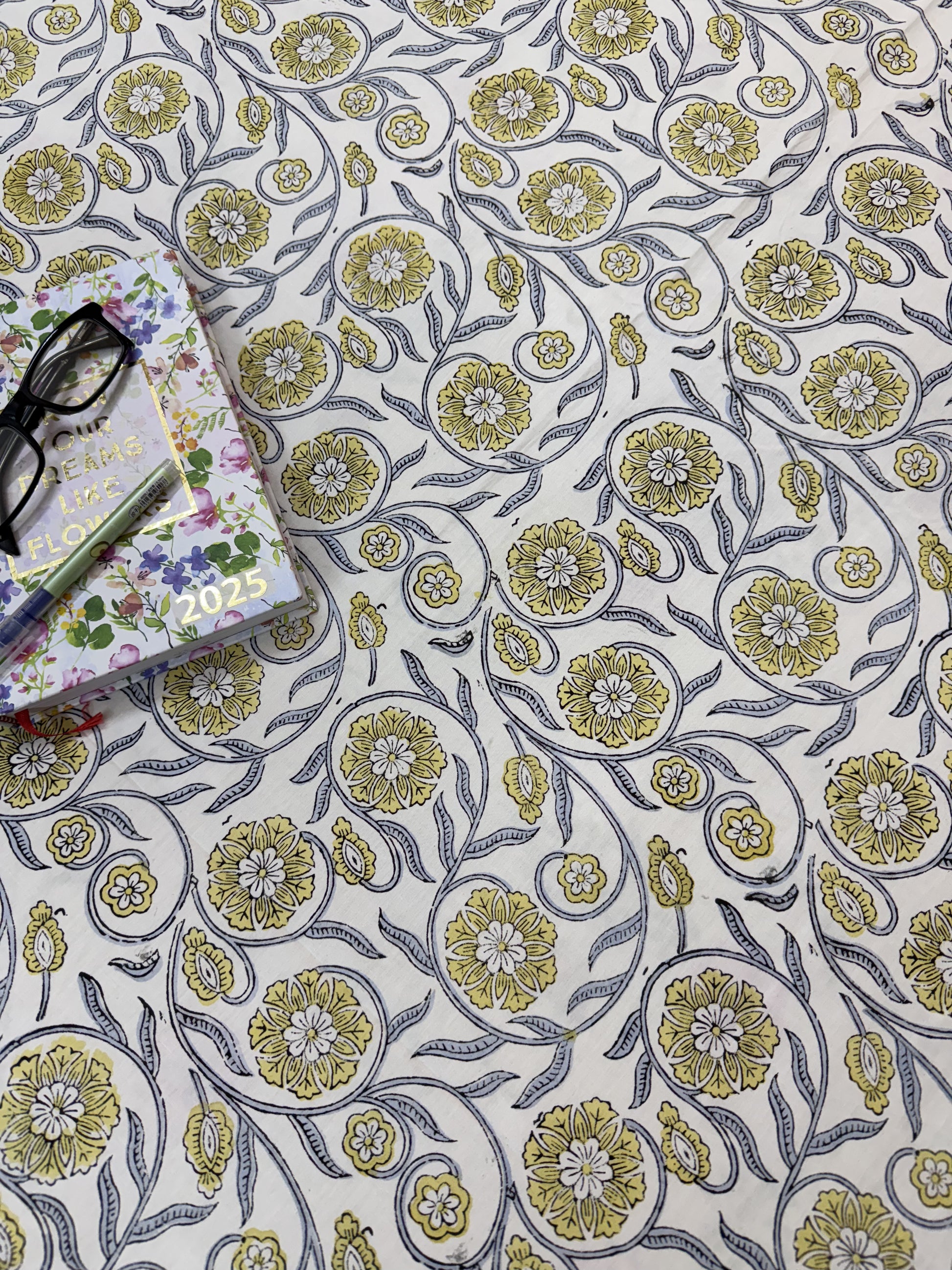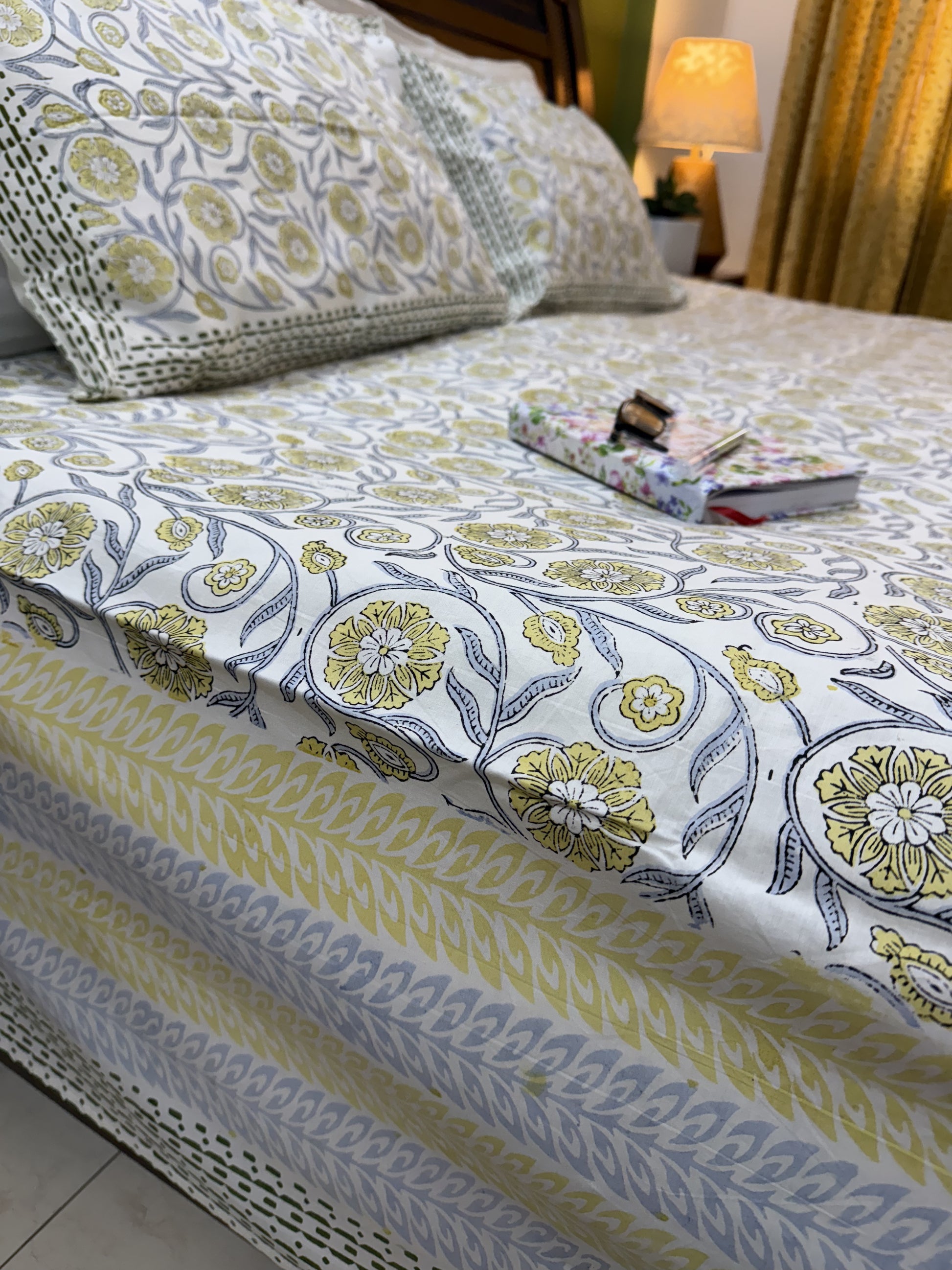Indulge in ultimate comfort and luxury with our hand block printed King Size Bedsheet featuring delicate yellow florals on premium cotton fabric. Enhance your sleeping experience with this soft, breathable bedding.