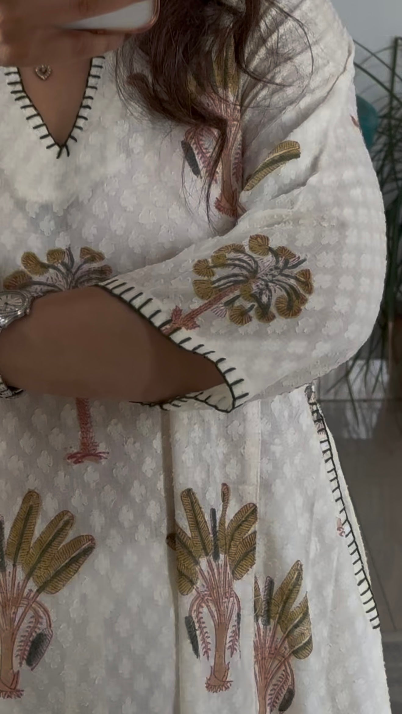 This relaxed A-line kurti features a flattering princess-cut silhouette with panels, offering both ease and elegance. The round neckline with a V-slit, 3/4th sleeves, and functional side pockets make it ideal for everyday wear. Delicate Kantha detailing on the neckline, sleeves, and pockets adds a handcrafted charm to this versatile piece.