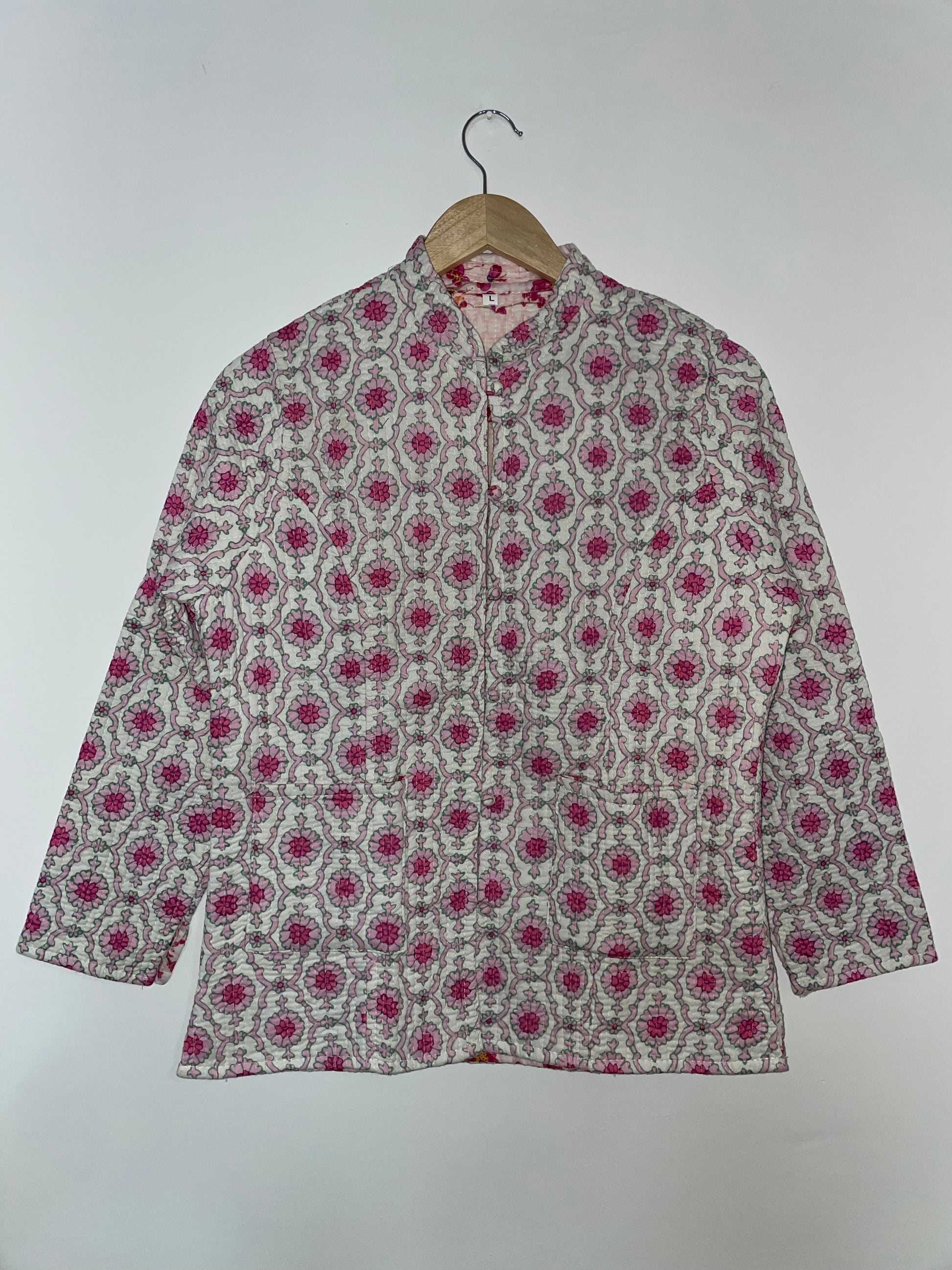 This reversible quilted jacket is a perfect blend of comfort, warmth, and style. Crafted from soft 100% cotton cambric, it features eye-catching block prints on both sides—allowing you to switch up your look with ease. The light quilting adds just the right amount of coziness, while the straight fit and collared neckline make it ideal for casual and semi-formal outings alike.