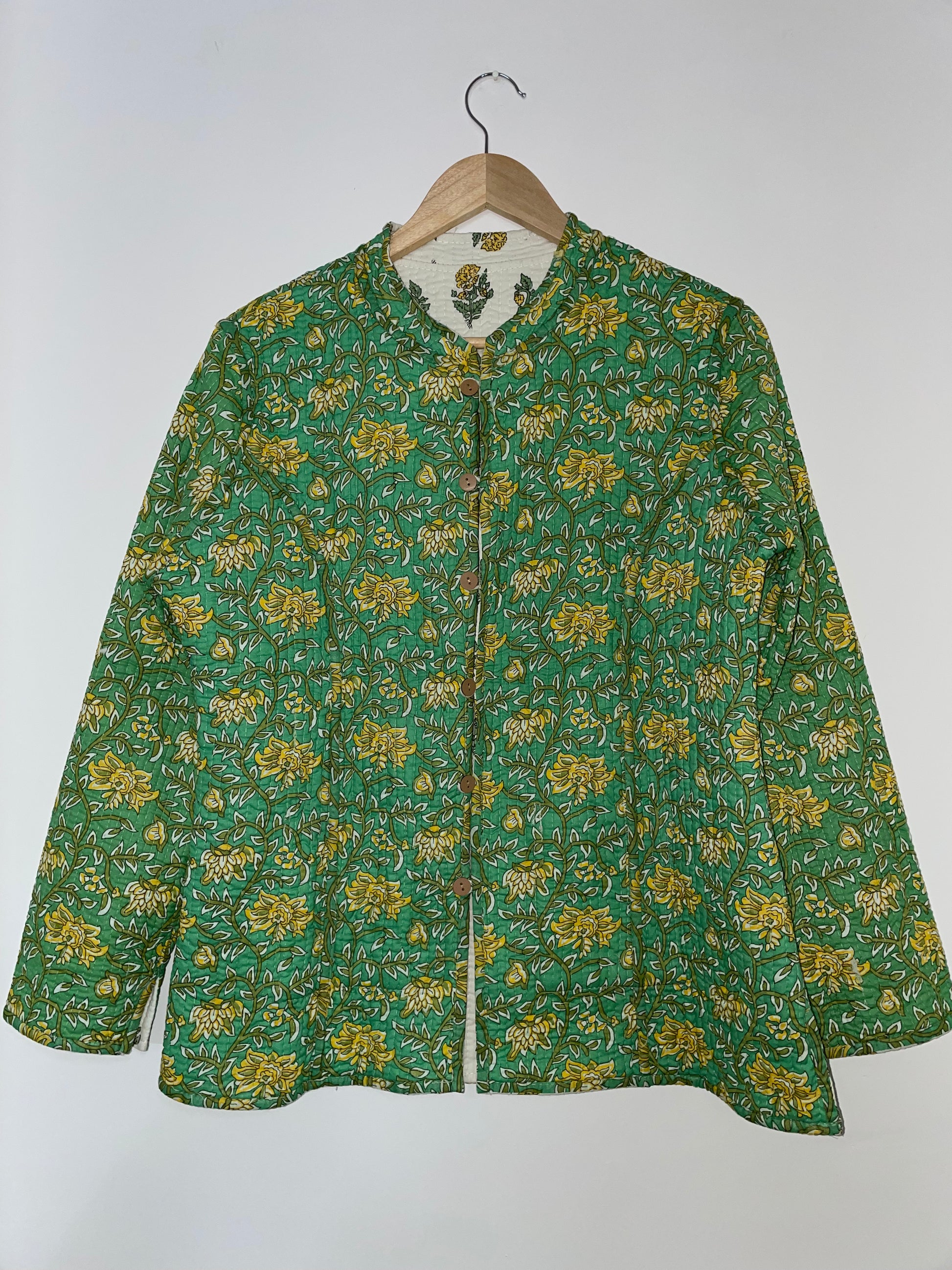 This reversible quilted jacket is a perfect blend of comfort, warmth, and style. Crafted from soft 100% cotton cambric, it features eye-catching block prints on both sides—allowing you to switch up your look with ease. The light quilting adds just the right amount of coziness, while the straight fit and collared neckline make it ideal for casual and semi-formal outings alike.